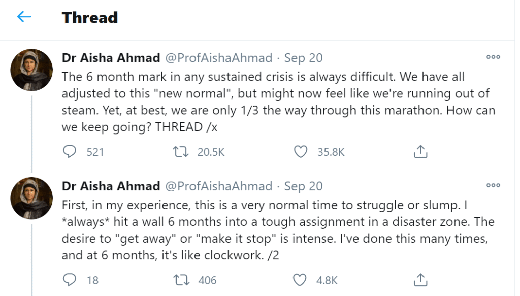 Many people found Professor Aisha Ahmad’s “6-month wall” Twitter thread to be very helpful. I did too.